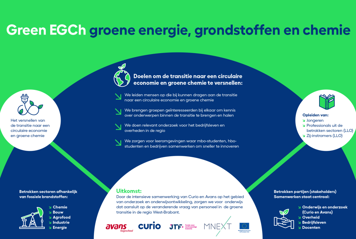 Green EGCh staat voor Groene Energie Grondstoffen en Chemie en is een intensieve samenwerking tussen Avans, Curio en werkveldpartners. Deze samenwerking is mogelijk gemaakt door steun uit het Europese Just Transition Fund (JTF). JTF draagt bij aan de overgang naar een Klimaatneutraal Europa. Door de intensieve samenwerking van Curio en Avans op het gebied van onderzoek en onderwijsontwikkeling, zorgen we voor onderwijs dat aansluit op de veranderende vraag van personeel in de groene transitie in de regio West-Brabant.